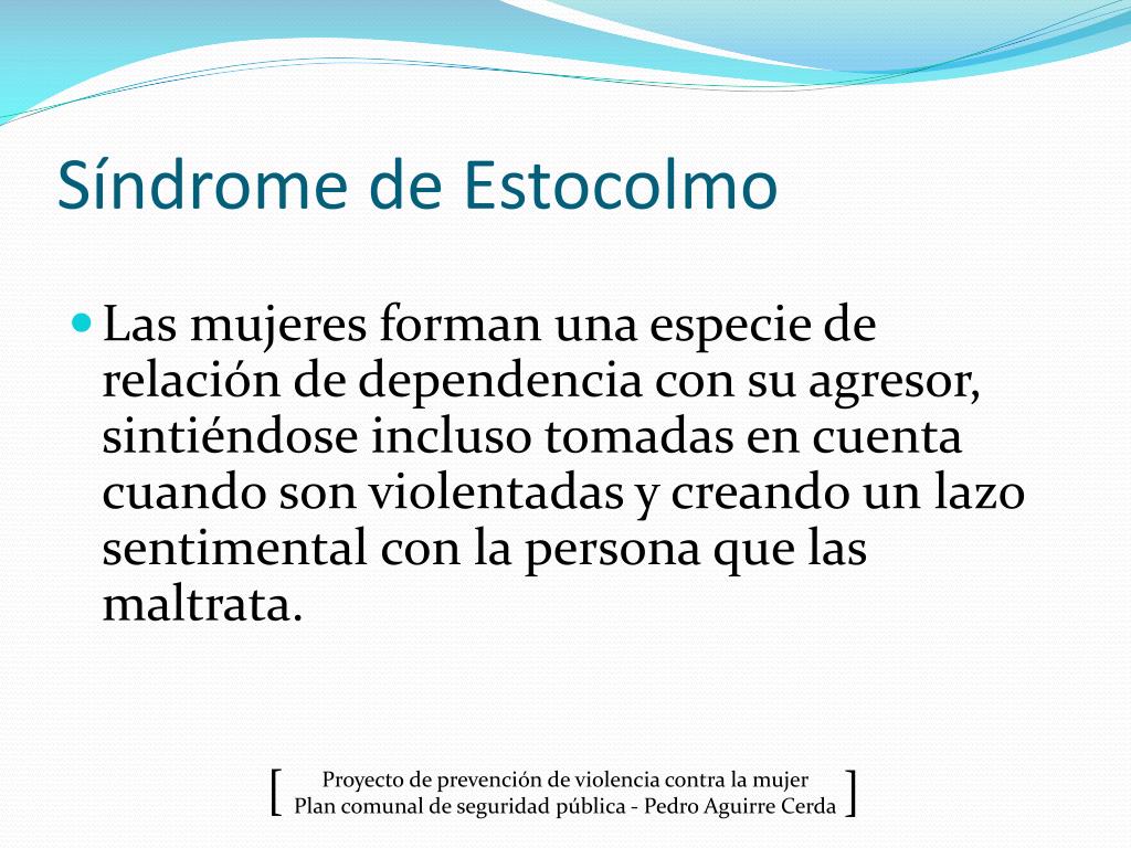 Síndrome de Estocolmo • Las mujeres forman una especie de relación de dependencia con su agresor, sintiéndose incluso tomadas en cuenta cuando son violentadas y creando un lazo sentimental con la persona que las maltrata.