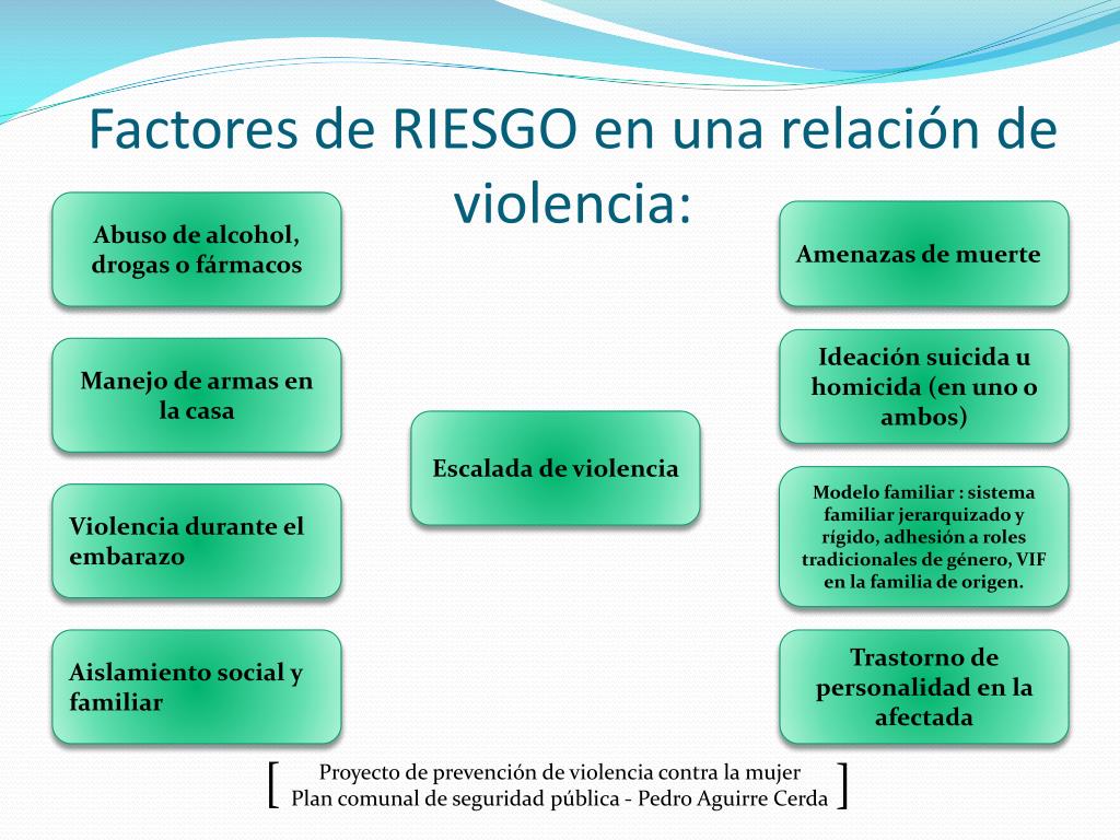 Factores de RIESGO en una relación de violencia: Abuso de alcohol, drogas o fármacos Amenazas de muerte Ideación suicida u homicida (en uno o ambos) Manejo de armas en la casa Escalada de violencia Modelo familiar : sistema familiar jerarquizado y rígido, adhesión a roles tradicionales de género, VIF en la familia de origen. Violencia durante el embarazo Aislamiento social y familiar Trastorno de personalidad en la afectada