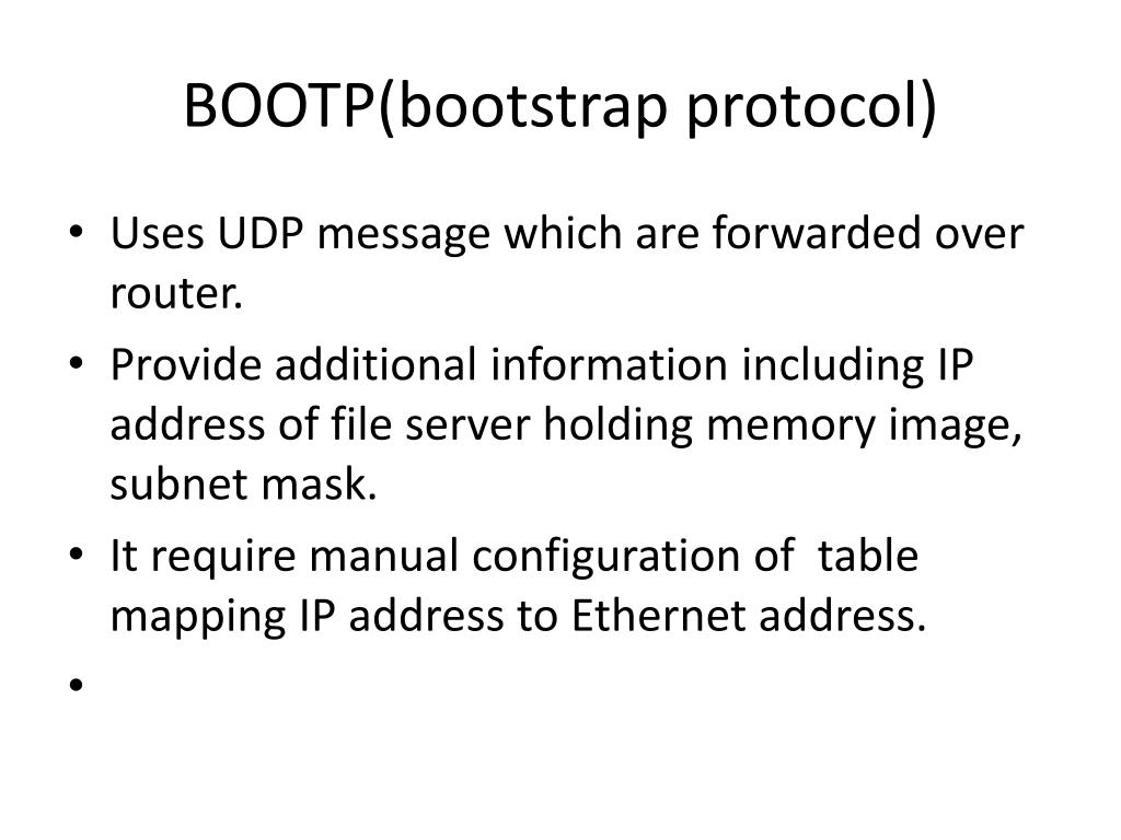 BOOTP(bootstrap protocol) • Uses UDP message which are forwarded over router. • Provide additional information including IP address of file server holding memory image, subnet mask. • It require manual configuration of table mapping IP address to Ethernet address.