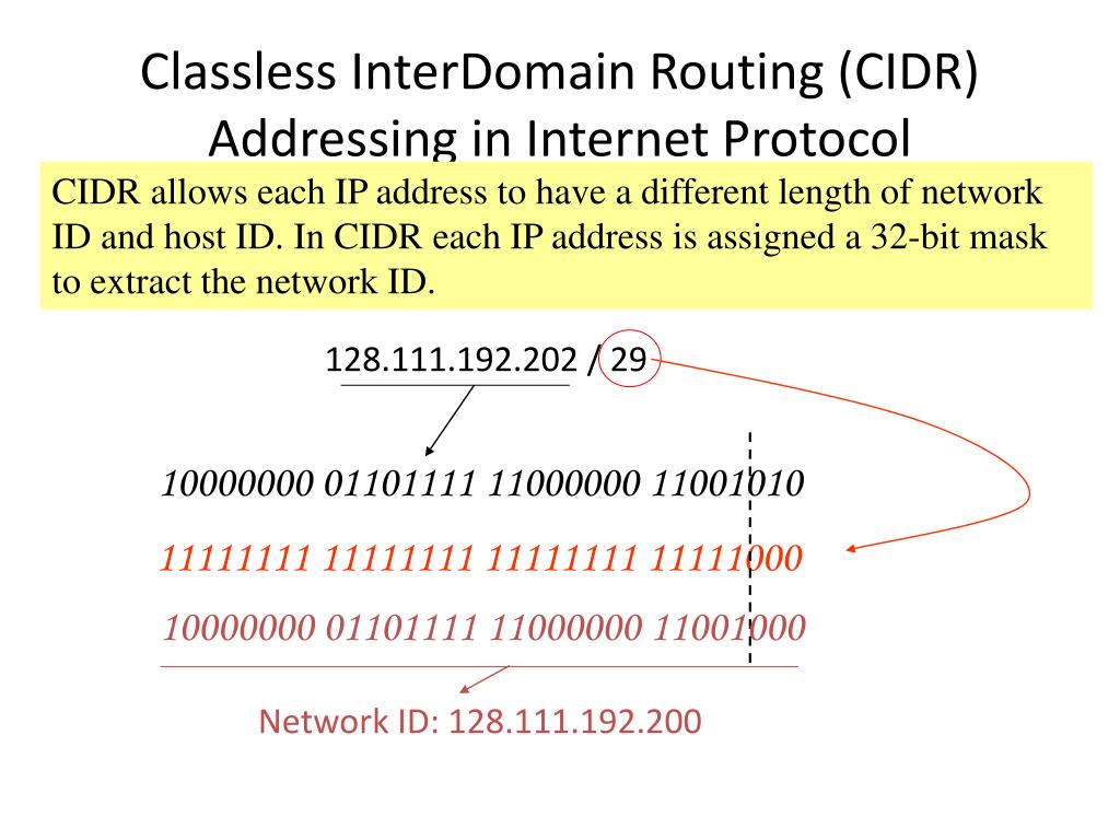 10000000 01101111 11000000 11001010 11111111 11111111 11111111 11111000 Network ID: 128.111.192.200 Classless InterDomain Routing (CIDR) Addressing in Internet Protocol CIDR allows each IP address to have a different length of network ID and host ID. In CIDR each IP address is assigned a 32-bit mask to extract the network ID. 128.111.192.202 / 29 10000000 01101111 11000000 11001000