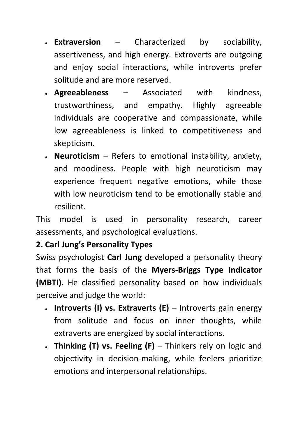 3. Extraversion assertiveness, and high energy. Extroverts are outgoing and enjoy social interactions, while introverts prefer solitude and are more reserved. – Associated trustworthiness, and empathy. Highly agreeable individuals are cooperative and compassionate, while low agreeableness is linked to competitiveness and skepticism. – Characterized by sociability, Agreeableness with kindness, Neuroticism– Refers to emotional instability, anxiety, and moodiness. People with high neuroticism may experience frequent negative emotions, while those with low neuroticism tend to be emotionally stable and resilient. This model is used in personality research, career assessments, and psychological evaluations. 2. Carl Jung’s Personality Types Swiss psychologist Carl Jung developed a personality theory that forms the basis of the Myers-Briggs Type Indicator (MBTI). He classified personality based on how individuals perceive and judge the world: Introverts (I) vs. Extraverts (E)– Introverts gain energy from solitude and focus on inner thoughts, while extraverts are energized by social interactions. Thinking (T) vs. Feeling (F)– Thinkers rely on logic and objectivity in decision-making, while feelers prioritize emotions and interpersonal relationships.