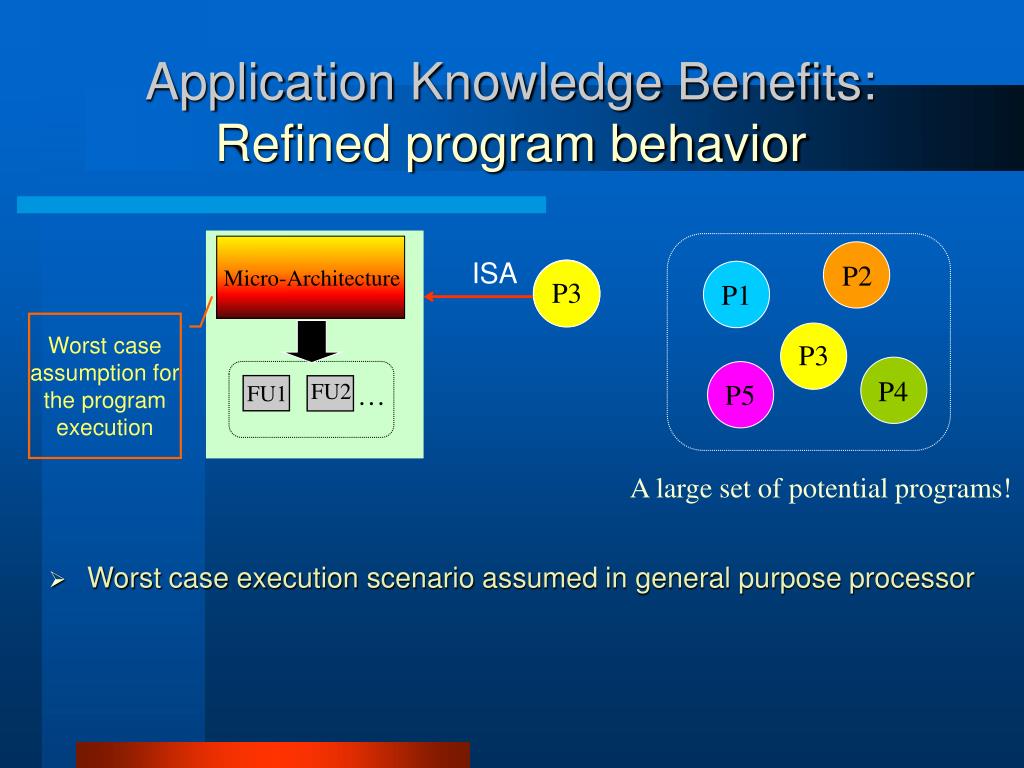 P2 P2 P1 P1 P3 P3 Application Knowledge Benefits:Refined program behavior ISA Micro-Architecture Worst case assumption for the program execution P4 FU2 … P5 FU1 A large set of potential programs! • Worst case execution scenario assumed in general purpose processor