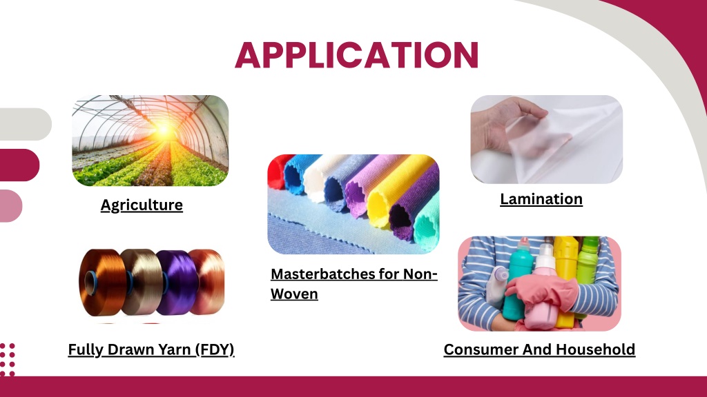 APPLICATION Lamination Agriculture Masterbatches for Non- Woven Fully Drawn Yarn (FDY) Consumer And Household