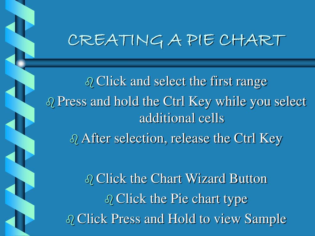 CREATING A PIE CHART • Click and select the first range • Press and hold the Ctrl Key while you select additional cells • After selection, release the Ctrl Key • Click the Chart Wizard Button • Click the Pie chart type • Click Press and Hold to view Sample