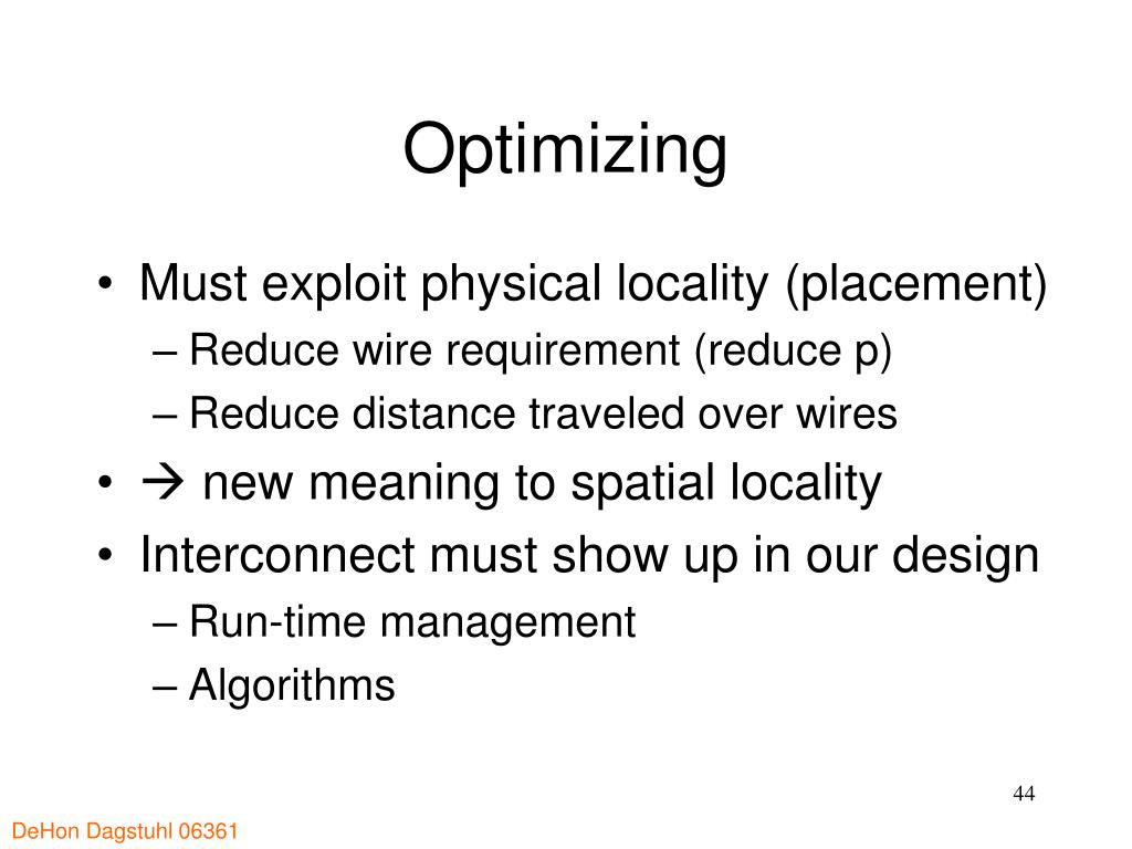 Optimizing • Must exploit physical locality (placement) • Reduce wire requirement (reduce p) • Reduce distance traveled over wires • new meaning to spatial locality • Interconnect must show up in our design • Run-time management • Algorithms