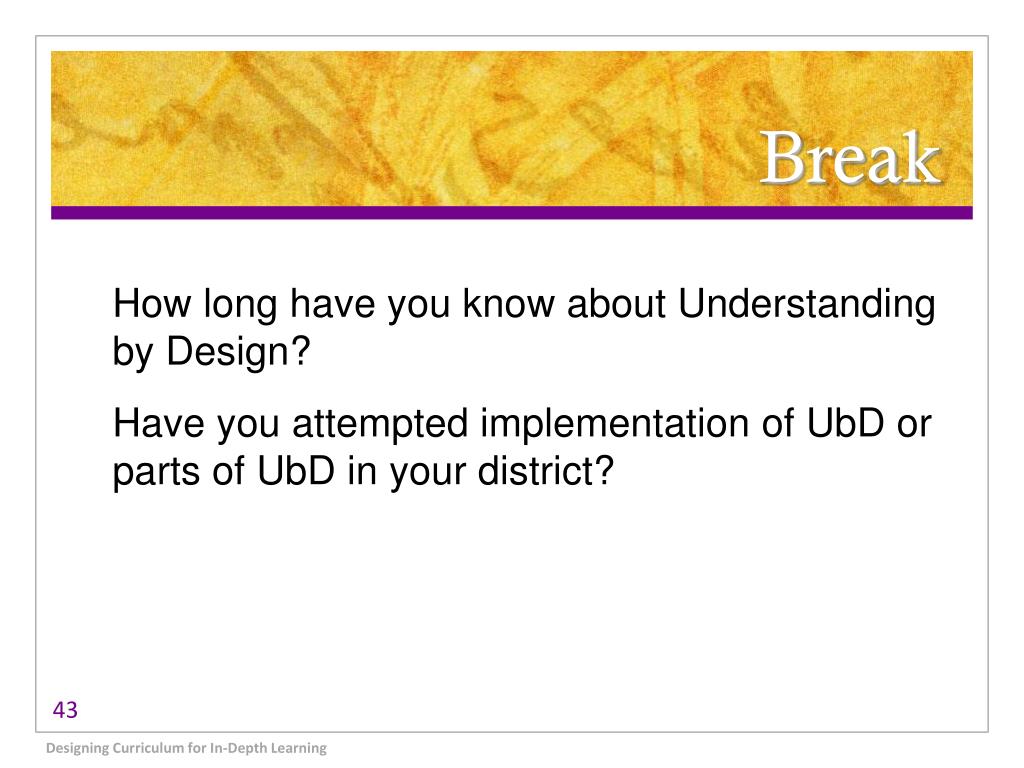 Break How long have you know about Understanding by Design? Have you attempted implementation of UbD or parts of UbD in your district? Designing Curriculum for In-Depth Learning