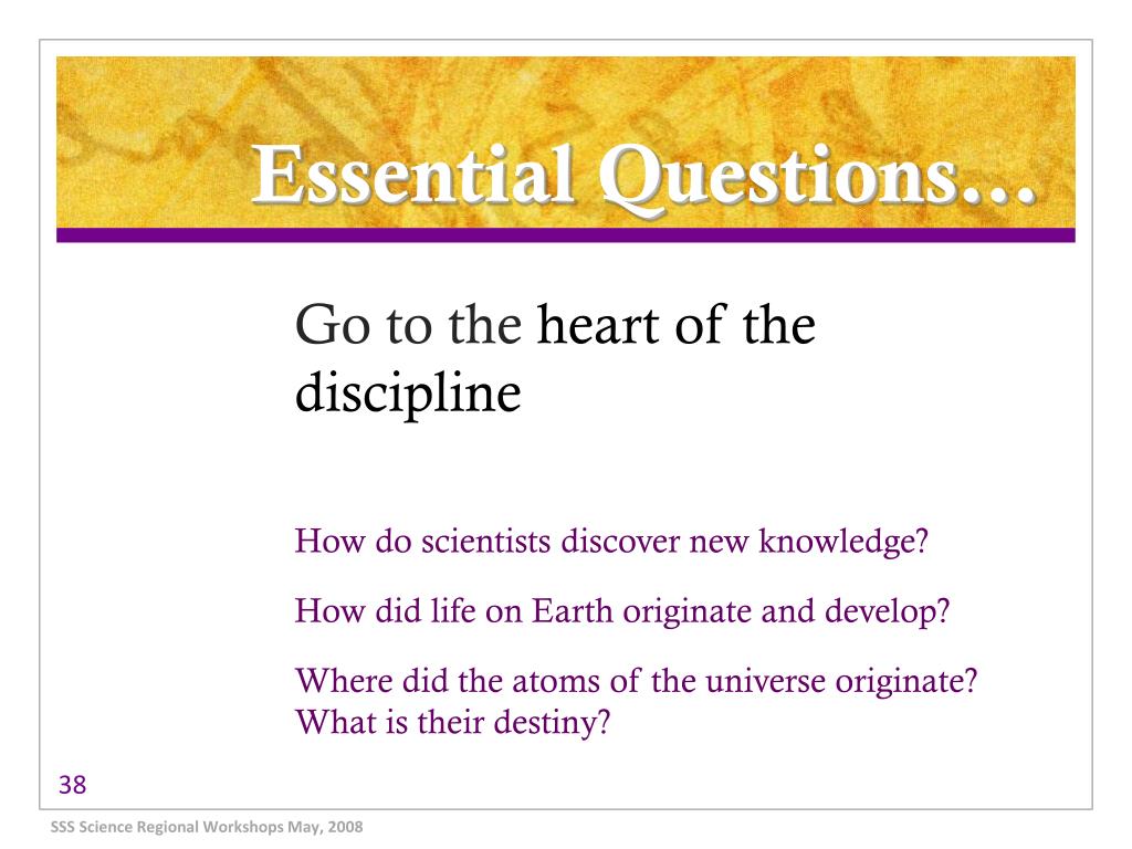 Essential Questions… Go to the heart of the discipline How do scientists discover new knowledge? How did life on Earth originate and develop? Where did the atoms of the universe originate? What is their destiny? SSS Science Regional Workshops May, 2008