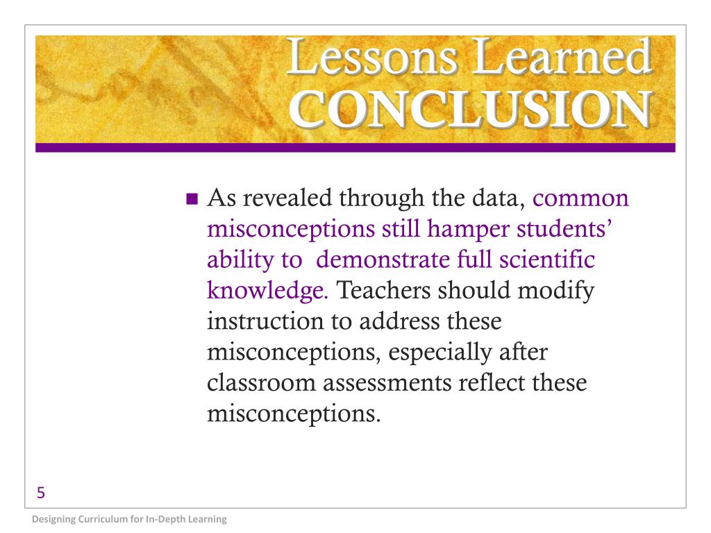Lessons LearnedCONCLUSION • As revealed through the data,common misconceptions still hamper students’ ability to demonstrate full scientific knowledge. Teachers should modify instruction to address these misconceptions, especially after classroom assessments reflect these misconceptions. Designing Curriculum for In-Depth Learning