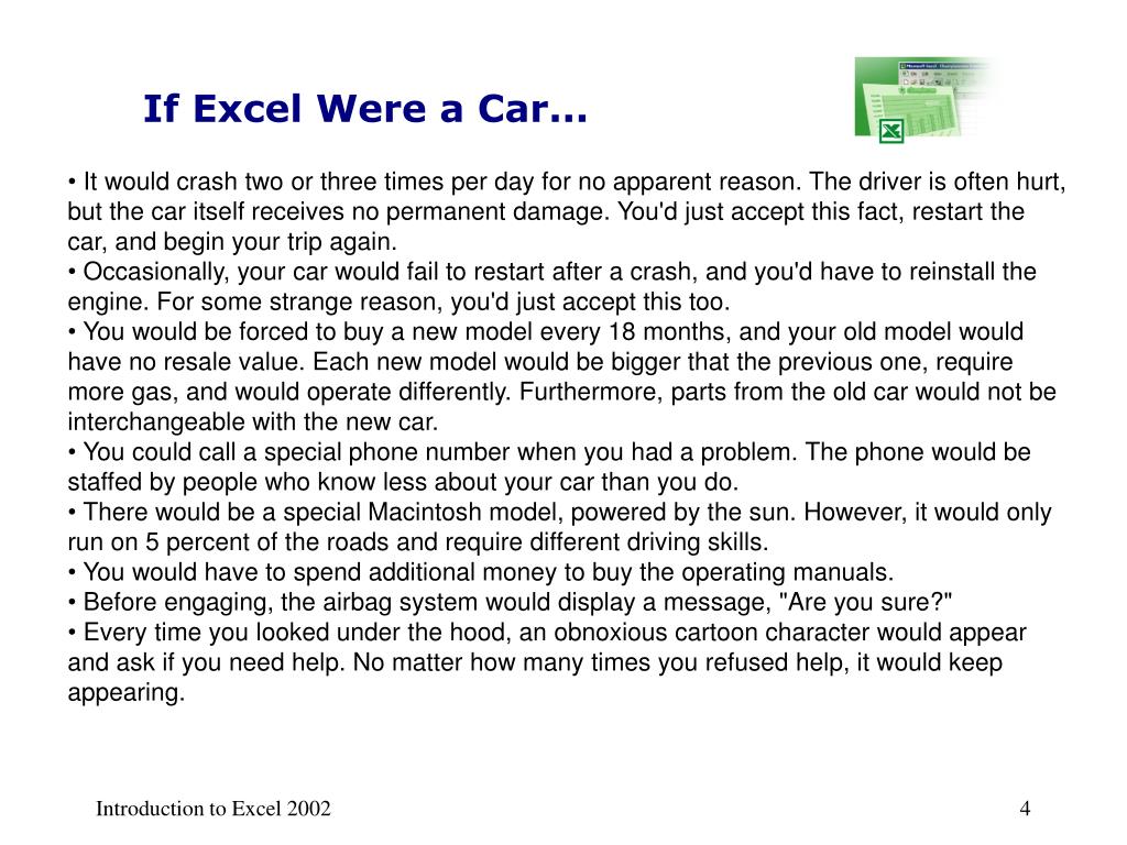 If Excel Were a Car... • It would crash two or three times per day for no apparent reason. The driver is often hurt, but the car itself receives no permanent damage. You'd just accept this fact, restart the car, and begin your trip again. • Occasionally, your car would fail to restart after a crash, and you'd have to reinstall the engine. For some strange reason, you'd just accept this too. • You would be forced to buy a new model every 18 months, and your old model would have no resale value. Each new model would be bigger that the previous one, require more gas, and would operate differently. Furthermore, parts from the old car would not be interchangeable with the new car. • You could call a special phone number when you had a problem. The phone would be staffed by people who know less about your car than you do. • There would be a special Macintosh model, powered by the sun. However, it would only run on 5 percent of the roads and require different driving skills. • You would have to spend additional money to buy the operating manuals. • Before engaging, the airbag system would display a message, "Are you sure?" • Every time you looked under the hood, an obnoxious cartoon character would appear and ask if you need help. No matter how many times you refused help, it would keep appearing. Introduction to Excel 2002