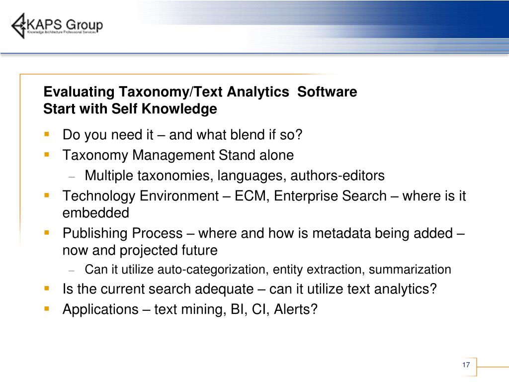 Evaluating Taxonomy/Text Analytics Software Start with Self Knowledge • Do you need it – and what blend if so? • Taxonomy Management Stand alone • Multiple taxonomies, languages, authors-editors • Technology Environment – ECM, Enterprise Search – where is it embedded • Publishing Process – where and how is metadata being added – now and projected future • Can it utilize auto-categorization, entity extraction, summarization • Is the current search adequate – can it utilize text analytics? • Applications – text mining, BI, CI, Alerts?