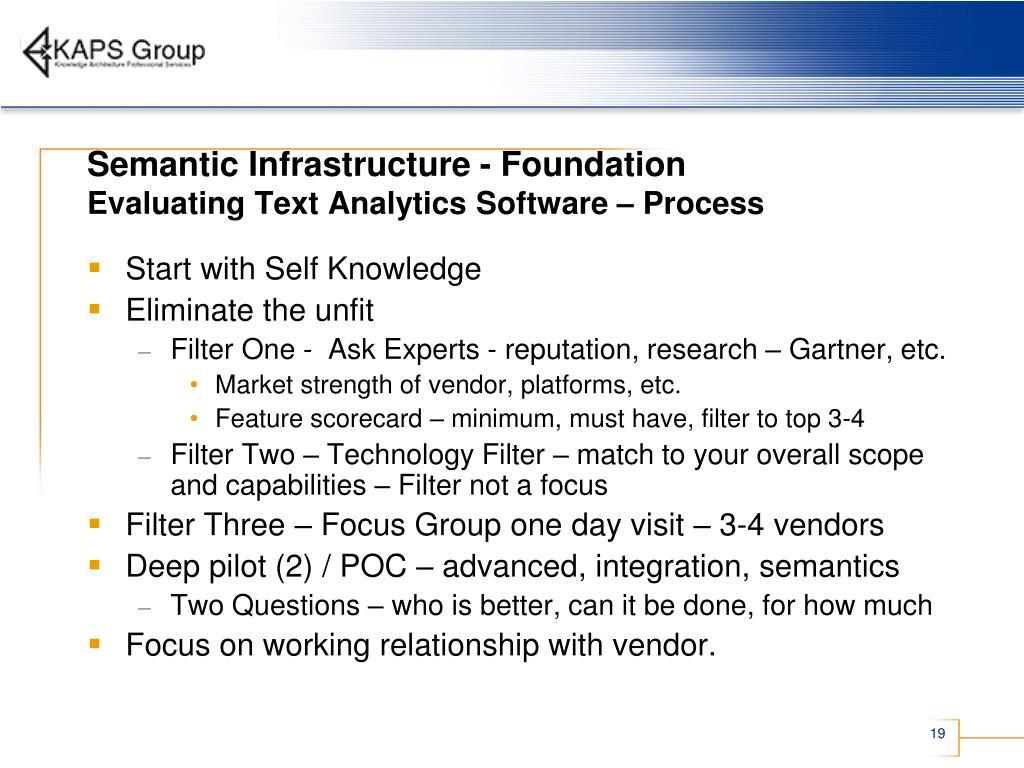 Semantic Infrastructure - Foundation Evaluating Text Analytics Software – Process • Start with Self Knowledge • Eliminate the unfit • Filter One - Ask Experts - reputation, research – Gartner, etc. • Market strength of vendor, platforms, etc. • Feature scorecard – minimum, must have, filter to top 3-4 • Filter Two – Technology Filter – match to your overall scope and capabilities – Filter not a focus • Filter Three – Focus Group one day visit – 3-4 vendors • Deep pilot (2) / POC – advanced, integration, semantics • Two Questions – who is better, can it be done, for how much • Focus on working relationship with vendor.