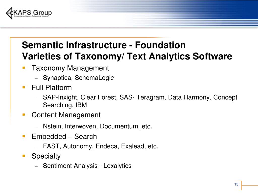 Semantic Infrastructure - Foundation Varieties of Taxonomy/ Text Analytics Software • Taxonomy Management • Synaptica, SchemaLogic • Full Platform • SAP-Inxight, Clear Forest, SAS- Teragram, Data Harmony, Concept Searching, IBM • Content Management • Nstein, Interwoven, Documentum, etc. • Embedded – Search • FAST, Autonomy, Endeca, Exalead, etc. • Specialty • Sentiment Analysis - Lexalytics