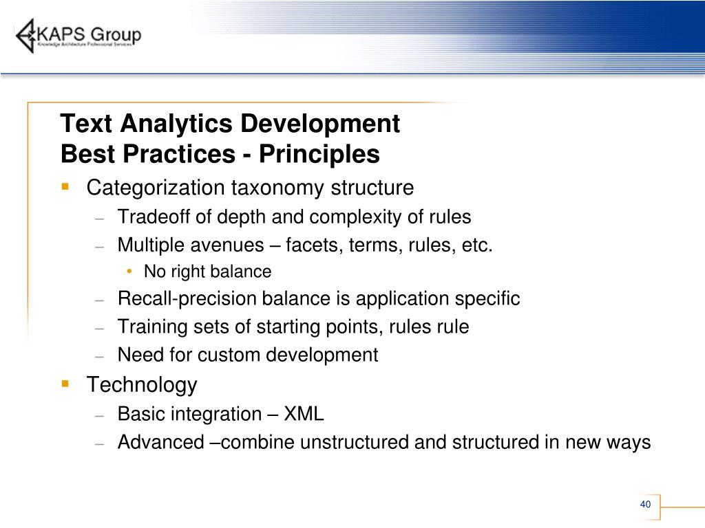 Text Analytics Development Best Practices - Principles • Importance of ongoing maintenance and refinement • Need dedicated taxonomy team working with SME’s • Work with application developers to incorporate text analytics into new applications • Importance of metrics and feedback • Software and social • Questions: • What are important subjects (and changes) • What information do they need? • How is their information related to other silos?