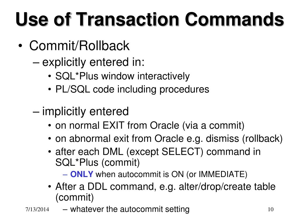 Use of Transaction Commands • Commit/Rollback • explicitly entered in: • SQL*Plus window interactively • PL/SQL code including procedures • implicitly entered • on normal EXIT from Oracle (via a commit) • on abnormal exit from Oracle e.g. dismiss (rollback) • after each DML (except SELECT) command in SQL*Plus (commit) • ONLY when autocommit is ON (or IMMEDIATE) • After a DDL command, e.g. alter/drop/create table (commit) • whatever the autocommit setting
