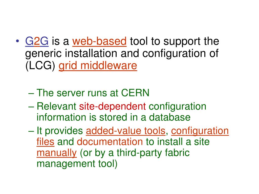 G2G is a web-based tool to support the generic installation and configuration of (LCG) grid middleware • The server runs at CERN • Relevant site-dependent configuration information is stored in a database • It provides added-value tools, configuration files and documentation to install a site manually (or by a third-party fabric management tool)