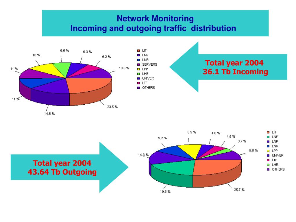 Network Monitoring Incoming and outgoing traffic distribution Total year 2004 36.1 Tb Incoming Total year 2004 43.64 Tb Outgoing