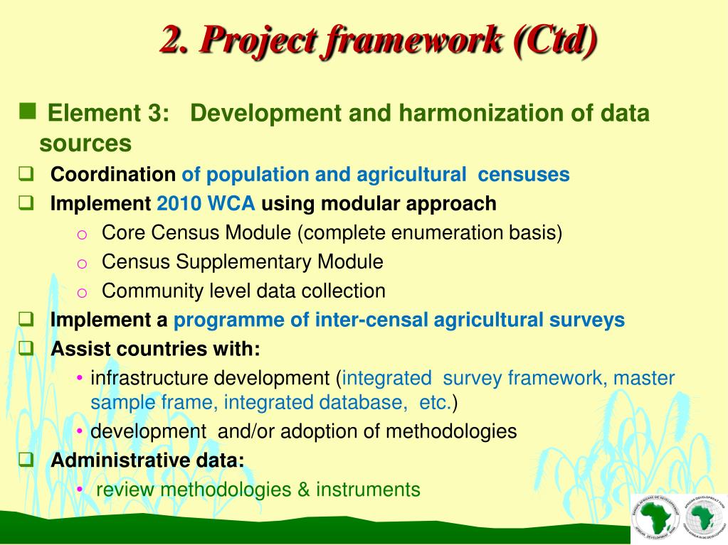 2. Project framework (Ctd) • Element 3: Development and harmonization of data sources • Coordination of population and agricultural censuses • Implement 2010 WCA using modular approach • Core Census Module (complete enumeration basis) • Census Supplementary Module • Community level data collection • Implement a programme of inter-censal agricultural surveys • Assist countries with: • infrastructure development (integrated survey framework, master sample frame, integrated database, etc.) • development and/or adoption of methodologies • Administrative data: • review methodologies & instruments