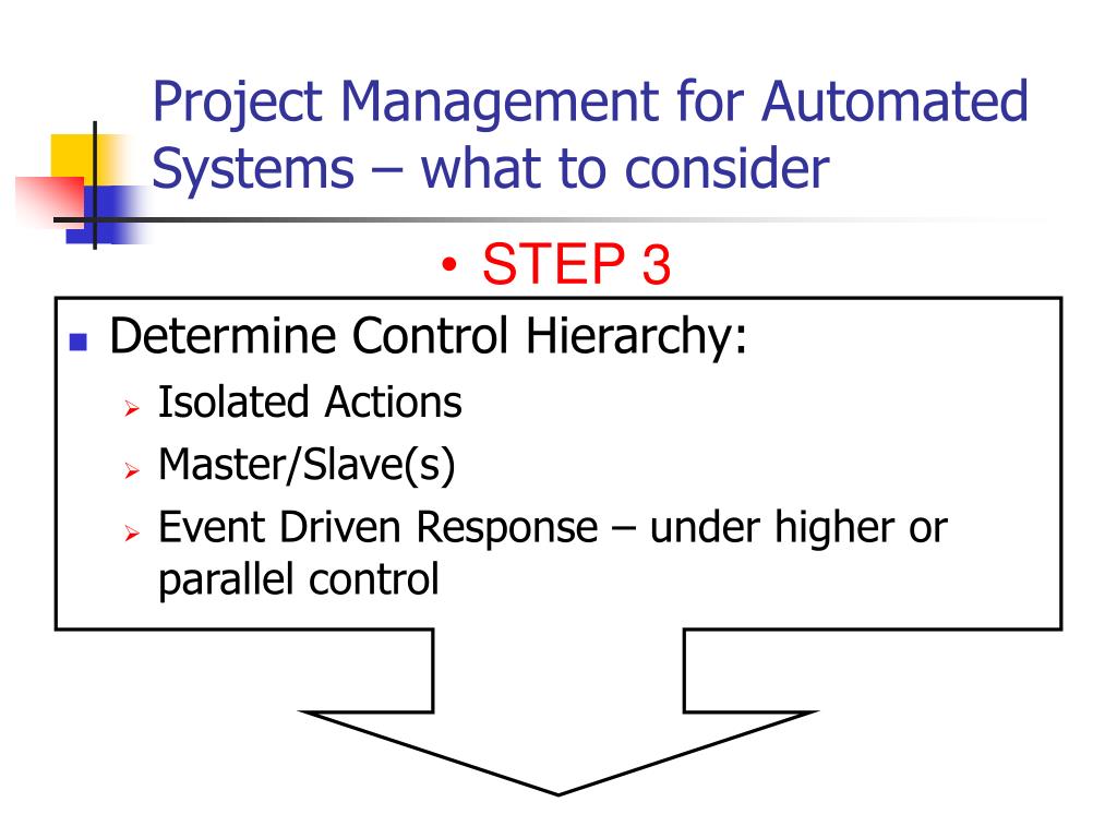 Project Management for Automated Systems – what to consider STEP 3 • Determine Control Hierarchy: • Isolated Actions • Master/Slave(s) • Event Driven Response – under higher or parallel control