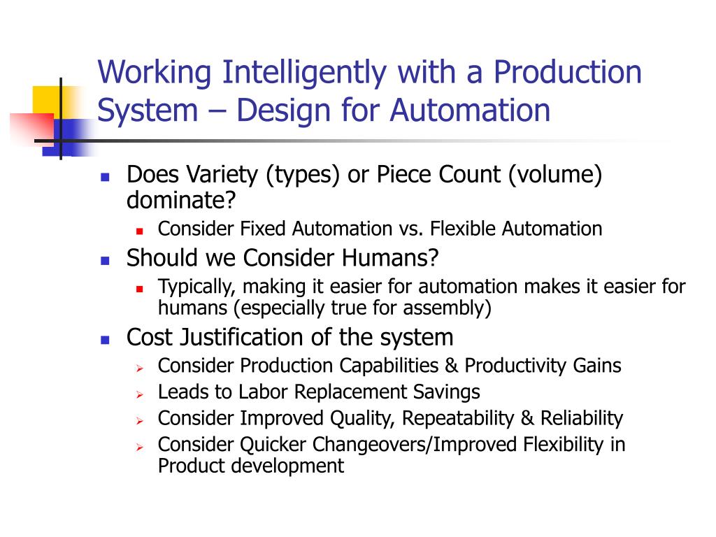 Working Intelligently with a Production System – Design for Automation • Does Variety (types) or Piece Count (volume) dominate? • Consider Fixed Automation vs. Flexible Automation • Should we Consider Humans? • Typically, making it easier for automation makes it easier for humans (especially true for assembly) • Cost Justification of the system • Consider Production Capabilities & Productivity Gains • Leads to Labor Replacement Savings • Consider Improved Quality, Repeatability & Reliability • Consider Quicker Changeovers/Improved Flexibility in Product development