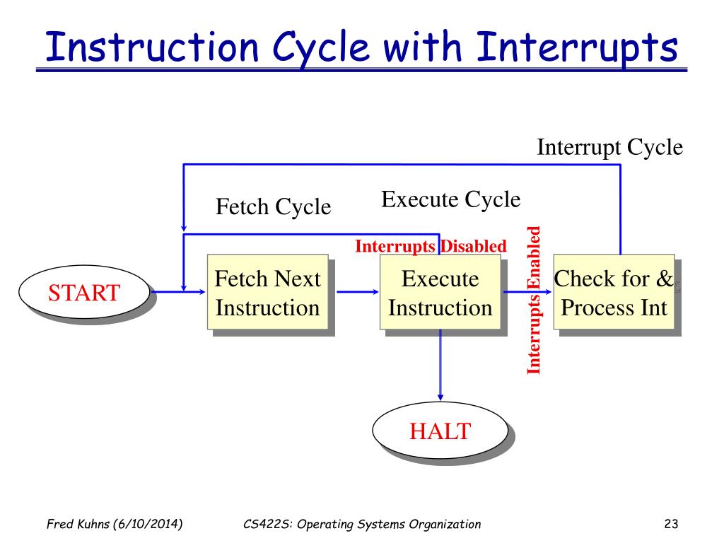 Instruction Cycle with Interrupts Interrupt Cycle Execute Cycle Fetch Cycle Interrupts Disabled Check for & Process Int Fetch Next Instruction Execute Instruction START Interrupts Enabled HALT CS422S: Operating Systems Organization