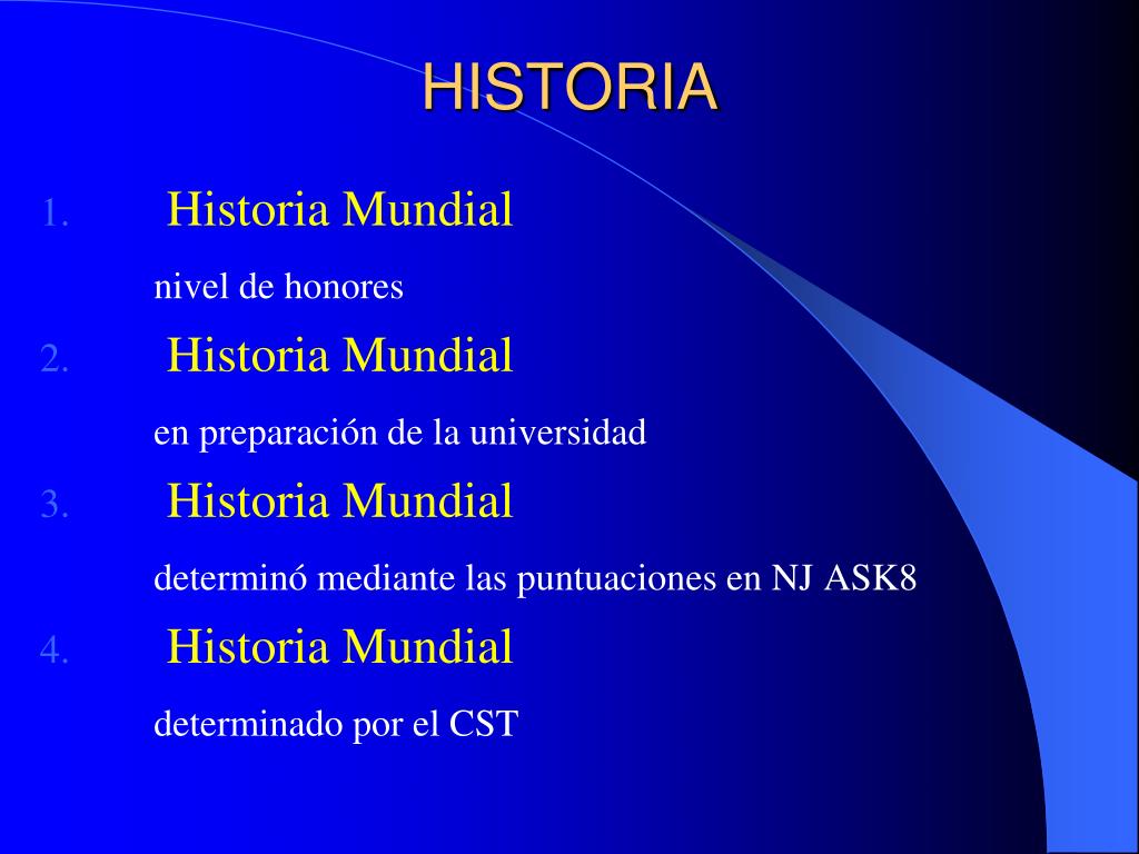 HISTORIA Historia Mundial nivel de honores Historia Mundial en preparación de la universidad Historia Mundial determinó mediante las puntuaciones en NJ ASK8 Historia Mundial determinado por el CST