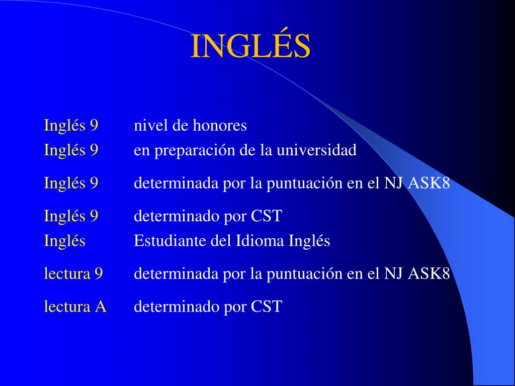 INGLÉS Inglés 9 Inglés 9 Inglés 9 Inglés 9 Inglés lectura 9 lectura A nivel de honores en preparación de la universidad determinada por la puntuación en el NJ ASK8 determinado por CST Estudiante del Idioma Inglés determinada por la puntuación en el NJ ASK8 determinado por CST