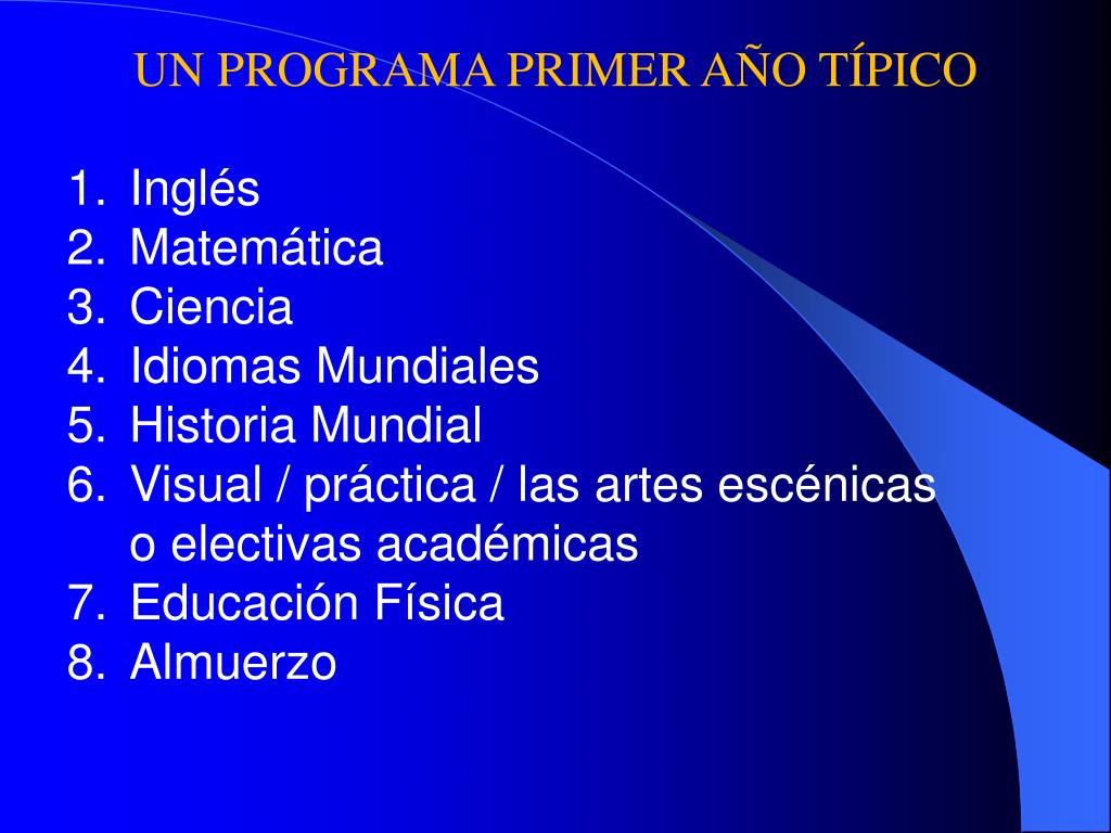 UN PROGRAMA PRIMER AÑO TÍPICO • Inglés • Matemática • Ciencia • Idiomas Mundiales • Historia Mundial • Visual / práctica / las artes escénicaso electivas académicas • Educación Física • Almuerzo