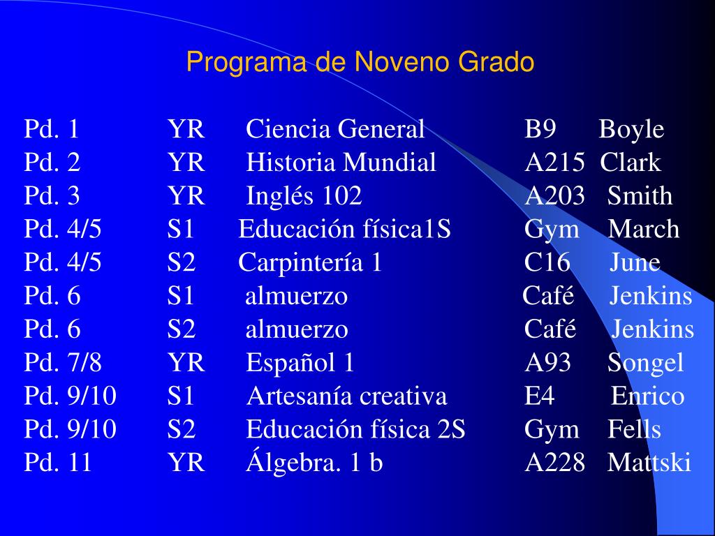 Programa de Noveno Grado Pd. 1 YR Ciencia General B9 Boyle Pd. 2 YR Historia Mundial A215 Clark Pd. 3 YR Inglés102 A203 Smith Pd. 4/5 S1 Educación física1S Gym March Pd. 4/5 S2 Carpintería 1 C16 June Pd. 6 S1 almuerzo Café Jenkins Pd. 6 S2 almuerzo Café Jenkins Pd. 7/8 YR Español 1 A93 Songel Pd. 9/10 S1 Artesanía creativa E4 Enrico Pd. 9/10 S2 Educación física2S Gym Fells Pd. 11 YR Álgebra. 1 b A228 Mattski