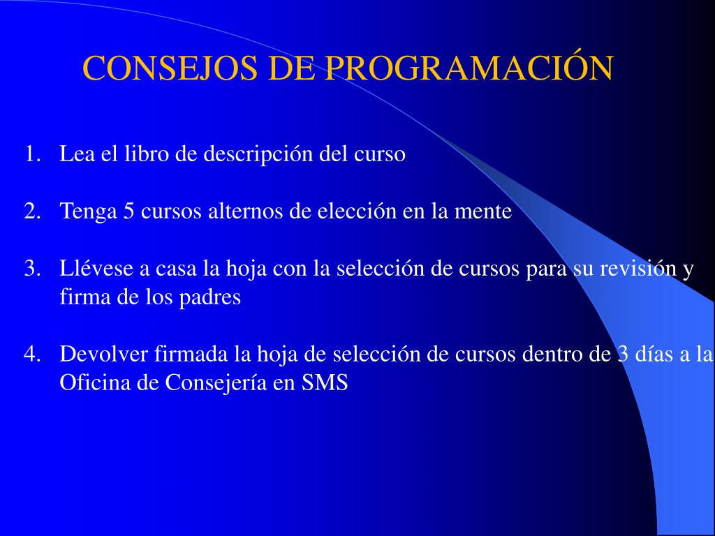 CONSEJOS DE PROGRAMACIÓN • Lea el libro de descripción del curso • Tenga 5 cursos alternos de elección en la mente • Llévese a casa la hoja con la selección de cursos para su revisión y firma de los padres • Devolver firmada la hoja de selección de cursos dentro de 3 días a laOficina de Consejería en SMS