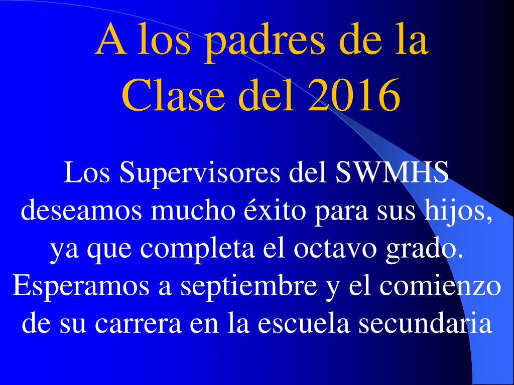 A los padres de la Clase del 2016 Los Supervisores del SWMHS deseamos mucho éxito para sus hijos, ya que completa el octavo grado. Esperamos a septiembre y el comienzo de su carrera en la escuela secundaria