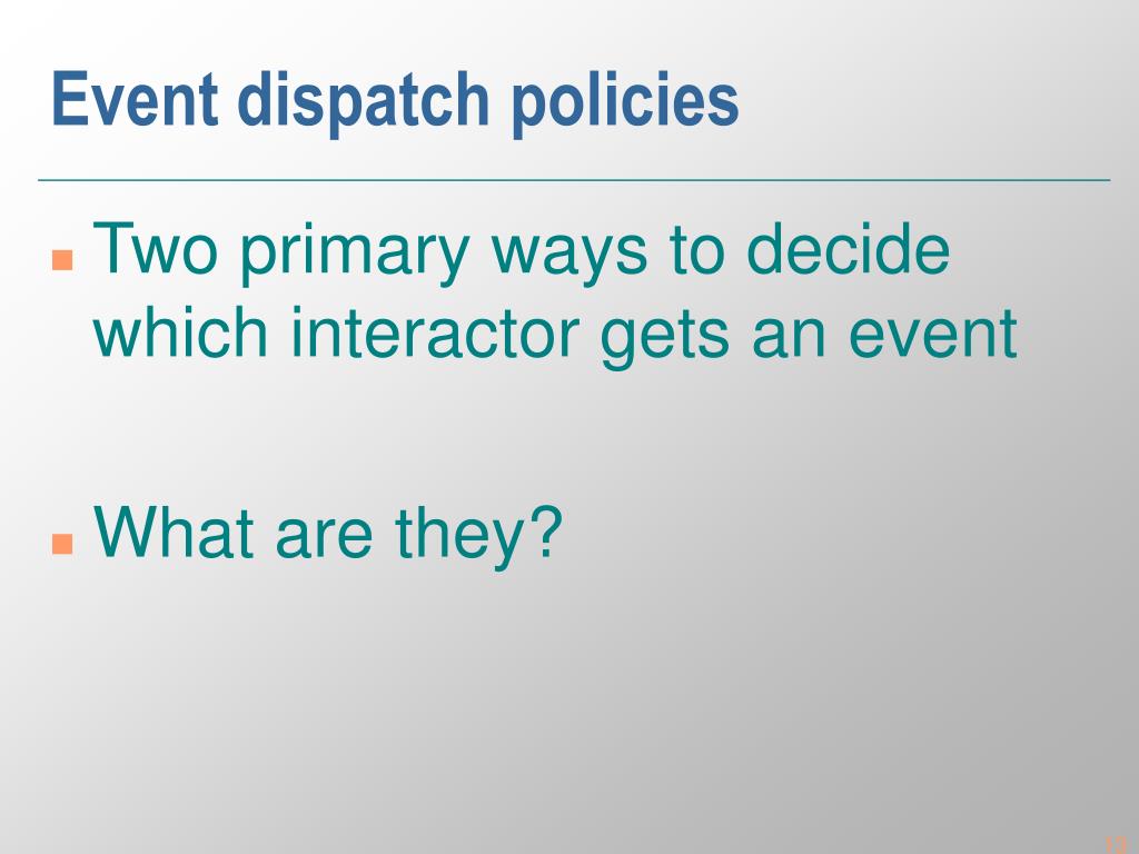Event dispatch policies • Two primary ways to decide which interactor gets an event • What are they?
