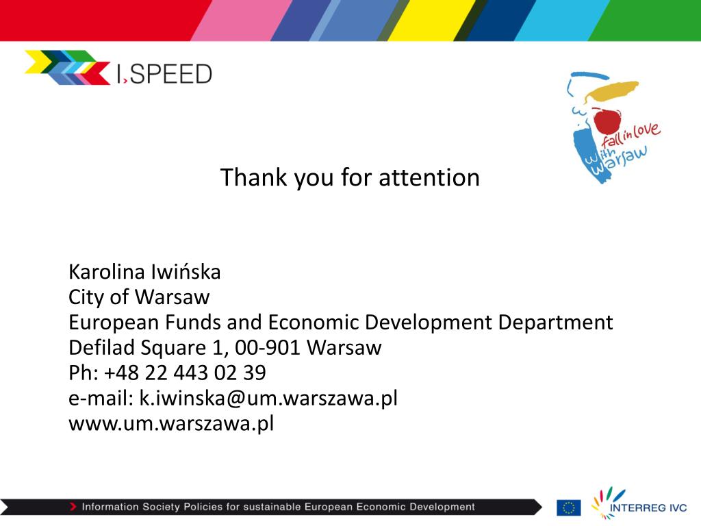 Thank you for attention • Karolina IwińskaCity of Warsaw • European Funds and Economic Development Department • Defilad Square 1, 00-901 Warsaw • Ph: +48 22 443 02 39 • e-mail: k.iwinska@um.warszawa.plwww.um.warszawa.pl