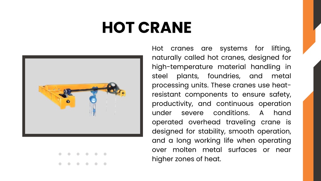 HOT CRANE Hot cranes are systems for lifting, naturally called hot cranes, designed for high-temperature material handling in steel plants, foundries, processing units. These cranes use heat- resistant components to ensure safety, productivity, and continuous operation under severe conditions. operated overhead traveling crane is designed for stability, smooth operation, and a long working life when operating over molten metal surfaces or near higher zones of heat. and metal A hand