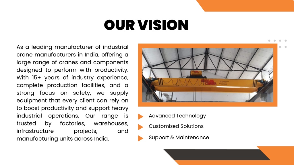 OUR VISION As a leading manufacturer of industrial crane manufacturers in India, offering a large range of cranes and components designed to perform with productivity. With 15+ years of industry experience, complete production facilities, and a strong focus on safety, we supply equipment that every client can rely on to boost productivity and support heavy industrial operations. Our range is trusted by factories, infrastructure manufacturing units across India. Advanced Technology warehouses, Customized Solutions projects, and Support & Maintenance