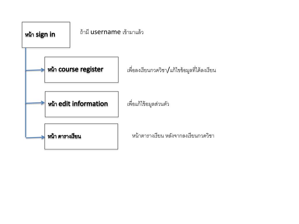 หน้า sign in ถ้ามี username เข้ามาแล้ว หน้า course register เพื่อลงเรียนกวดวิชา/แก้ไขข้อมูลที่ได้ลงเรียน หน้า edit information เพื่อแก้ไข้อมูลส่วนตัว หน้า ตารางเรียน หน้าตารางเรียน หลังจากลงเรียนกวดวิชา