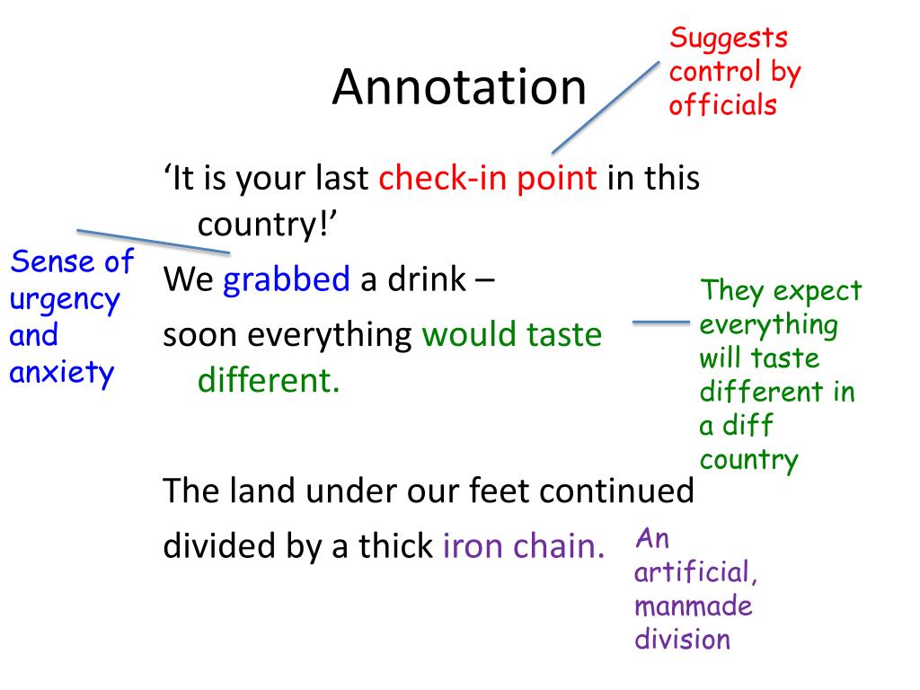 Suggests control by officials Annotation ‘It is your last check-in point in this country!’ We grabbed a drink – soon everything would taste different. The land under our feet continued divided by a thick iron chain. Sense of urgency and anxiety They expect everything will taste different in a diff country An artificial, manmade division