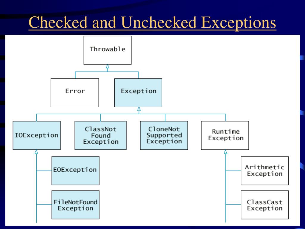 Checked Exceptions Compiler checks that you are aware of the exception Generally used for errors that can happen even in correct programs IOExceptionand its sublcasses are checked exceptions NullPointerException, ArrayIndexOutOfBoundsException , ... are unchecked --they are your fault :-) Virtual machine errors (e.g. OutOfMemoryError) are unchecked Classification not perfect. For example, Integer.parseIntthrows unchecked NumberFormatException Checked exceptions are subclasses of Exception that are not subclasses of RuntimeException