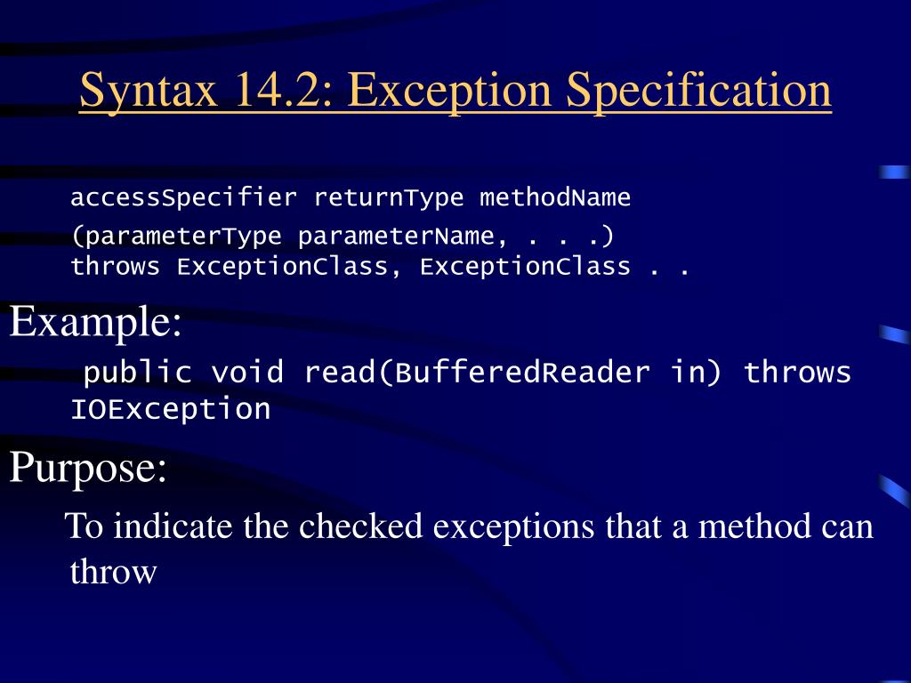 Syntax 14.2: Exception Specification accessSpecifier returnType methodName (parameterType parameterName, . . .)throws ExceptionClass, ExceptionClass . . Example: public void read(BufferedReader in) throws IOException Purpose: To indicate the checked exceptions that a method can throw