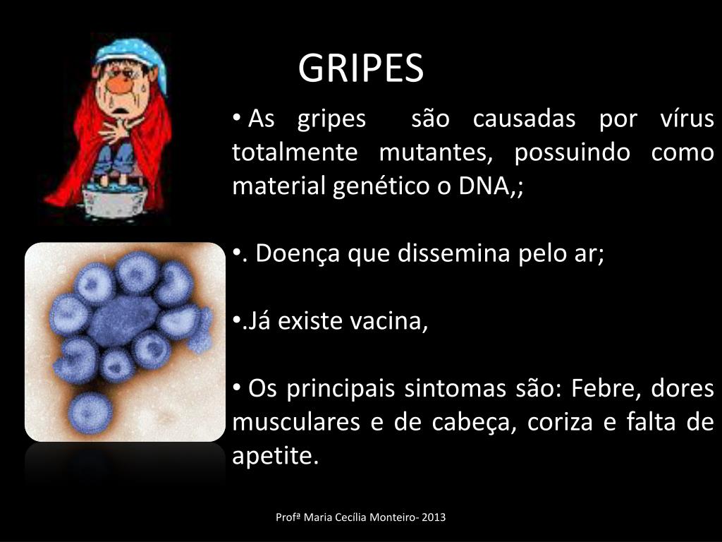 GRIPES • As gripes são causadas por vírus totalmente mutantes, possuindo como material genético o DNA,; • . Doença que dissemina pelo ar; • .Já existe vacina, • Os principais sintomas são: Febre, dores musculares e de cabeça, coriza e falta de apetite. Profª Maria Cecília Monteiro- 2013