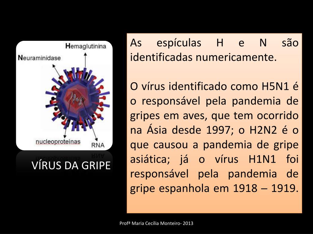 As espículas H e N são identificadas numericamente. O vírus identificado como H5N1 é o responsável pela pandemia de gripes em aves, que tem ocorrido na Ásia desde 1997; o H2N2 é o que causou a pandemia de gripe asiática; já o vírus H1N1 foi responsável pela pandemia de gripe espanhola em 1918 ─ 1919. VÍRUS DA GRIPE Profª Maria Cecília Monteiro- 2013