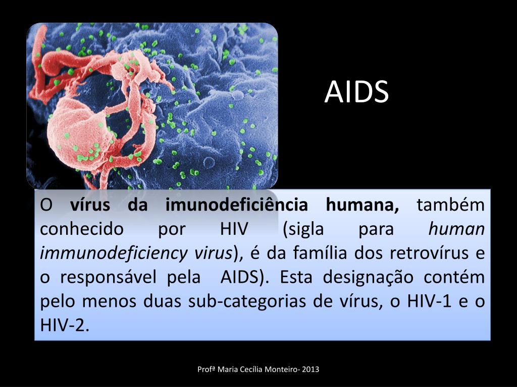 AIDS O vírus da imunodeficiência humana, também conhecido por HIV (sigla parahumanimmunodeficiencyvirus), é da família dos retrovírus e o responsável pela AIDS). Esta designação contém pelo menos duas sub-categorias de vírus, o HIV-1 e o HIV-2. Profª Maria Cecília Monteiro- 2013