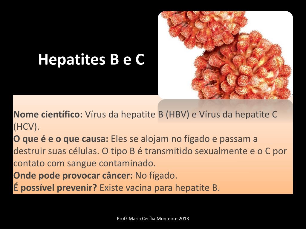 Hepatites B e C Nome científico: Vírus da hepatite B (HBV) e Vírus da hepatite C (HCV).O que é e o que causa: Eles se alojam no fígado e passam a destruir suas células. O tipo B é transmitido sexualmente e o C por contato com sangue contaminado.Onde pode provocar câncer: No fígado.É possível prevenir? Existe vacina para hepatite B. Profª Maria Cecília Monteiro- 2013
