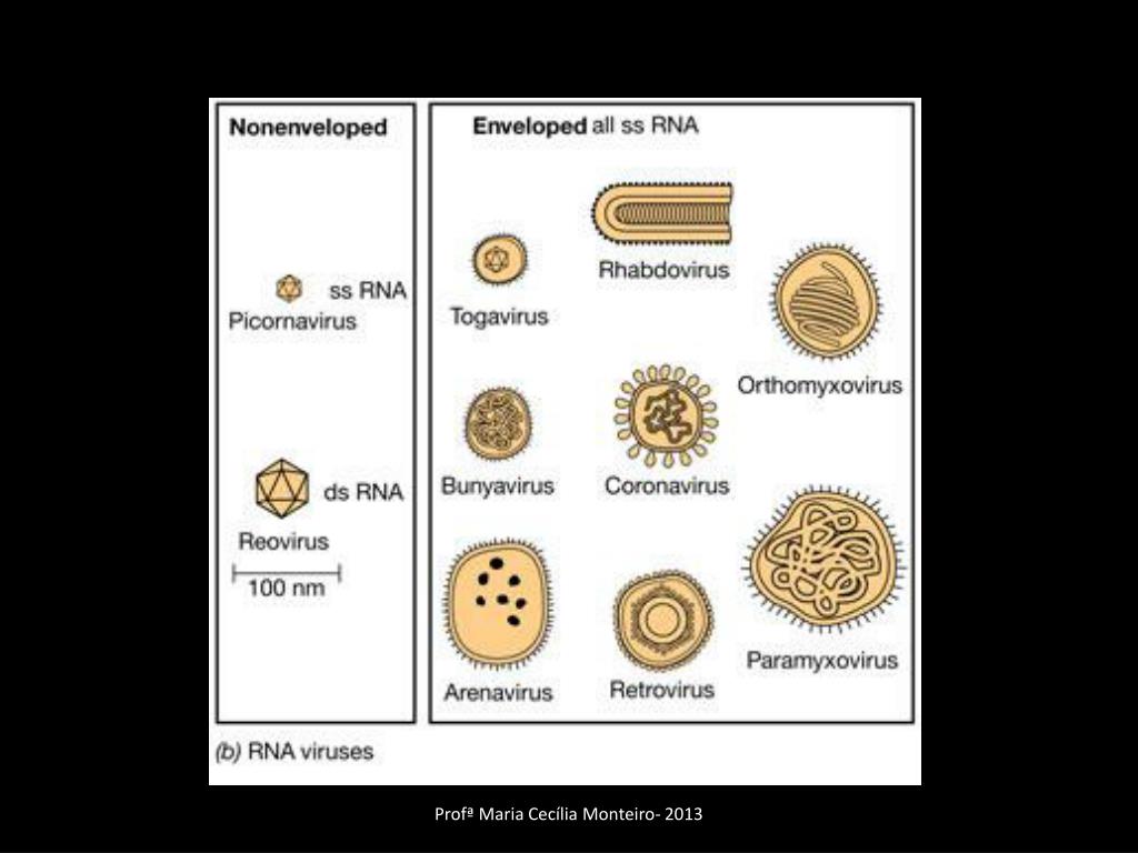 Características distintivas • Tipo de material genético (DNA ou RNA) • Tamanho e Forma • Natureza do envoltório (com ou sem envelope) • Genoma muito simples Profª Maria Cecília Monteiro- 2013