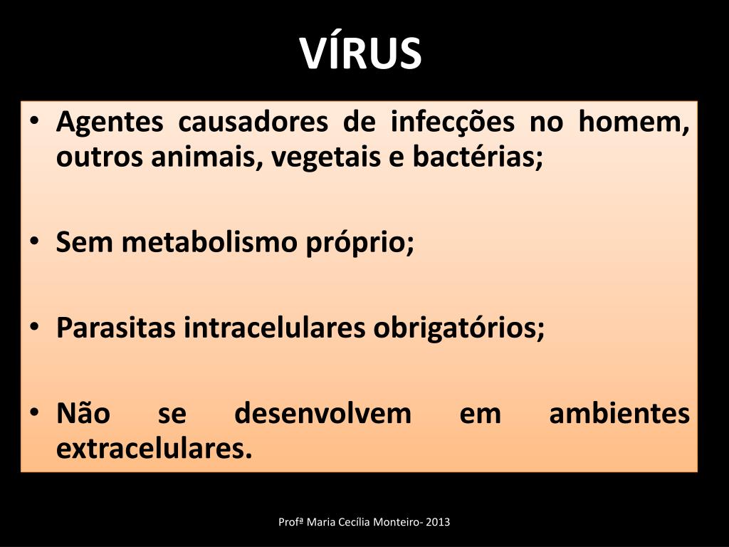 VÍRUS • Agentes causadores de infecções no homem, outros animais, vegetais e bactérias; • Sem metabolismo próprio; • Parasitas intracelulares obrigatórios; • Não se desenvolvem em ambientes extracelulares. Profª Maria Cecília Monteiro- 2013