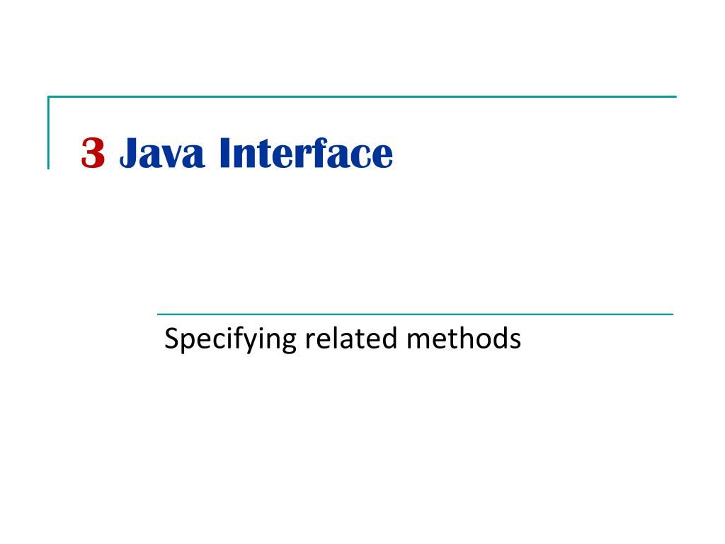 Java Interface 3. Java Interface [CS1020 Lecture 5 AY2013/4 S2] • Java interfaces provide a way to specify common behaviour for a set of (possibly unrelated) classes • Java interface can be used for ADT • It allows further abstraction/generalization • It uses the keyword interface, rather than class • It specifies methods to be implemented • A Java interface is a group of related methods with empty bodies • It can have constant definitions (which are implicitly public static final) • A class is said to implement the interface if it provides implementations for ALL the methods in the interface