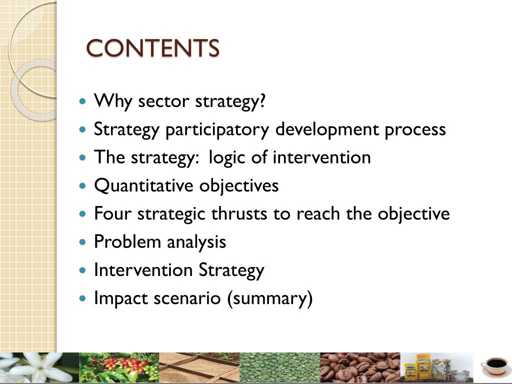 CONTENTS • Why sector strategy? • Strategy participatory development process • The strategy: logic of intervention • Quantitative objectives • Four strategic thrusts to reach the objective • Problem analysis • Intervention Strategy • Impact scenario (summary)