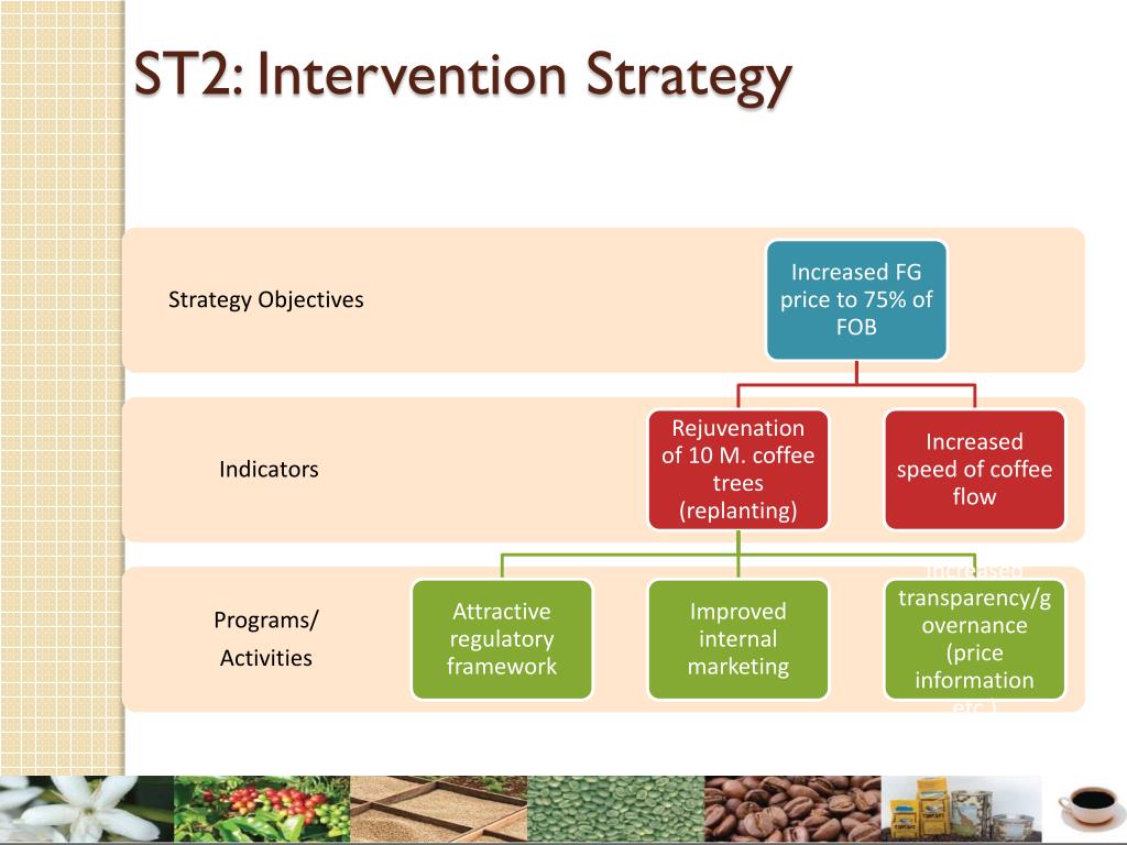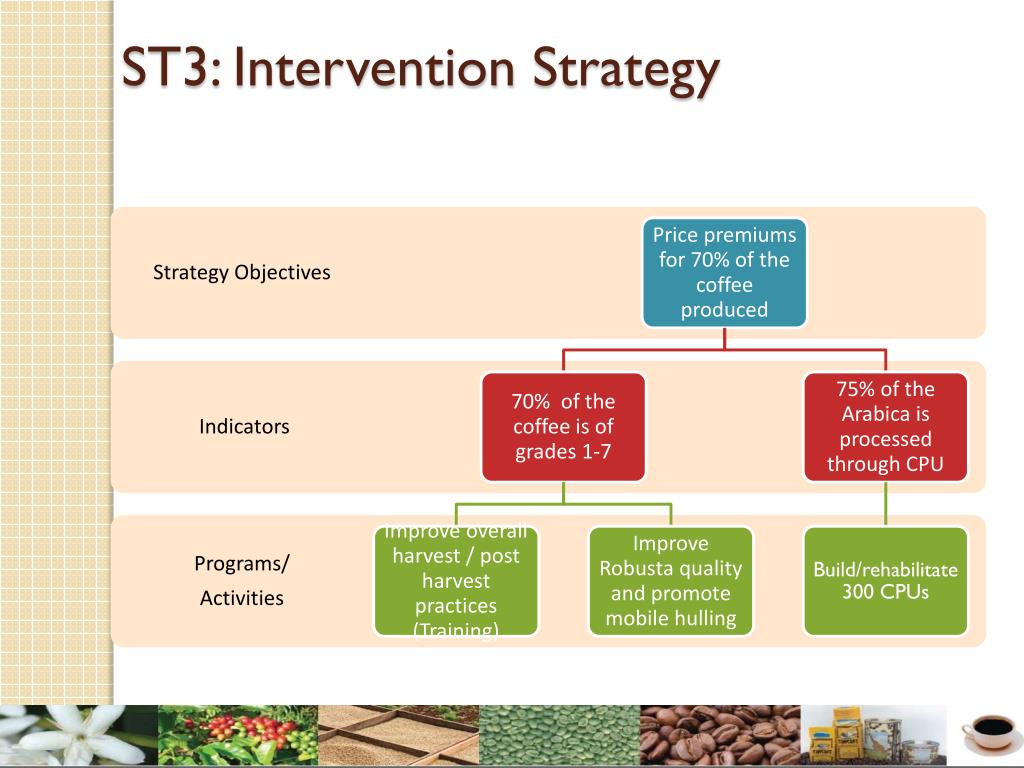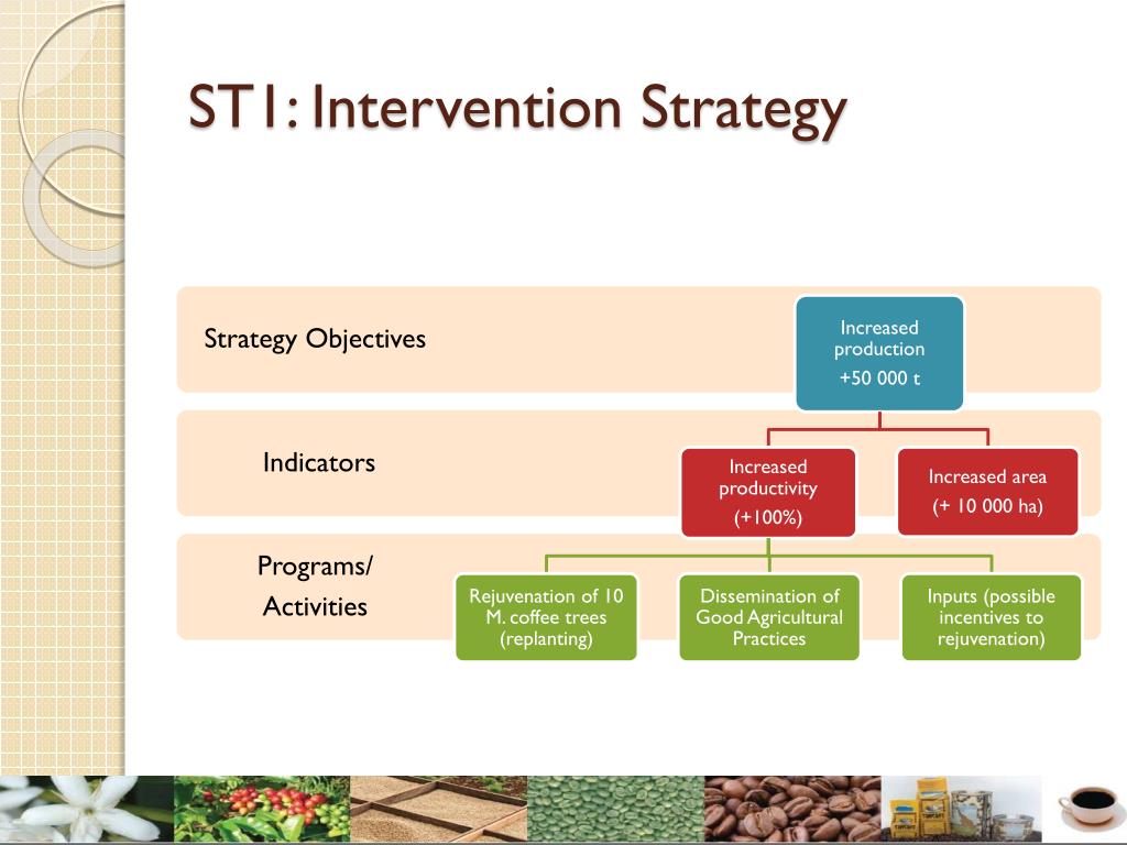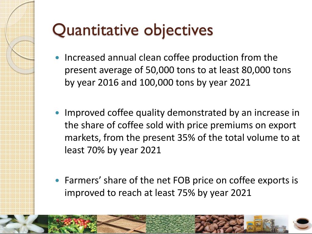 Quantitative objectives • Increased annual clean coffee production from the present average of 50,000 tons to at least 80,000 tons by year 2016 and 100,000 tons by year 2021 • Improved coffee quality demonstrated by an increase in the share of coffee sold with price premiums on export markets, from the present 35% of the total volume to at least 70% by year 2021 • Farmers’ share of the net FOB price on coffee exports is improved to reach at least 75% by year 2021