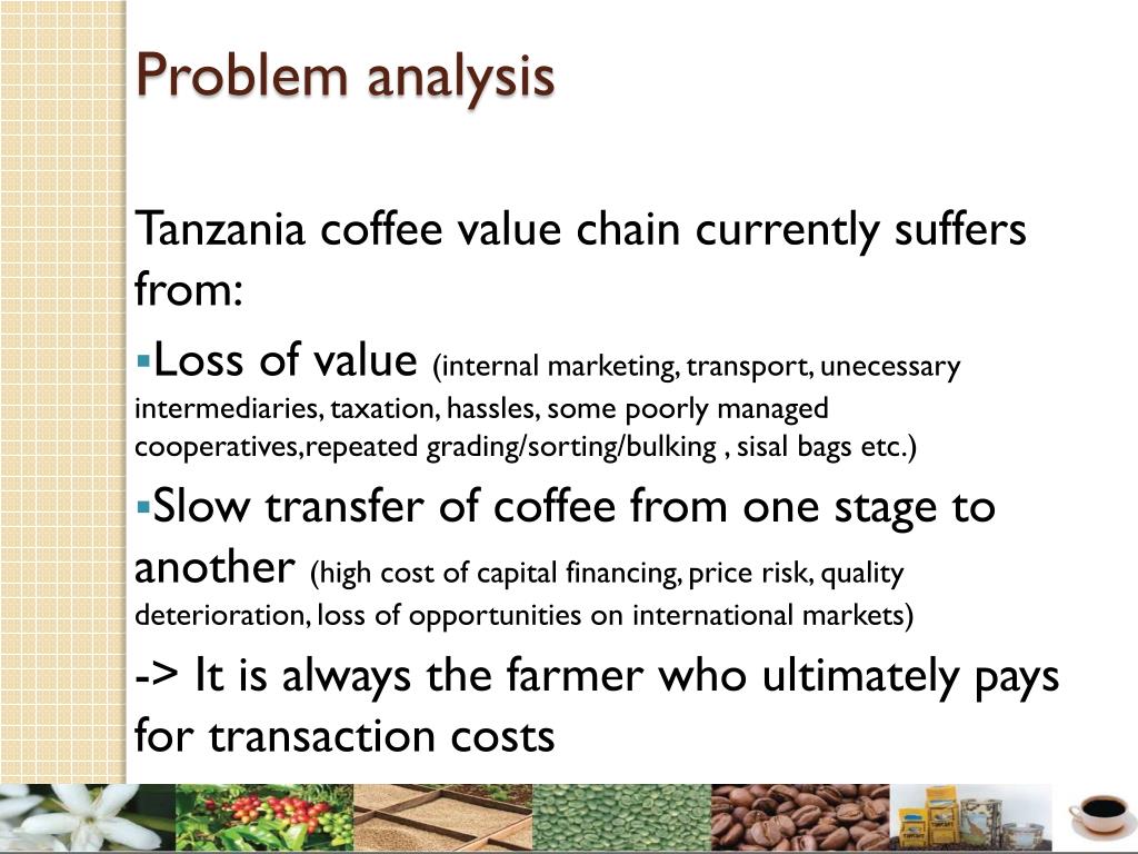 Problemanalysis Tanzania coffee value chaincurrentlysuffersfrom: • Loss of value (internal marketing, transport, unecessaryintermediaries, taxation, hassles, somepoorlymanagedcooperatives,repeatedgrading/sorting/bulking , sisal bags etc.) • Slow transfer of coffee from one stage to another(highcost of capital financing, pricerisk, qualitydeterioration, loss of opportunities on international markets) -> It isalways the farmerwhoultimately pays for transaction costs