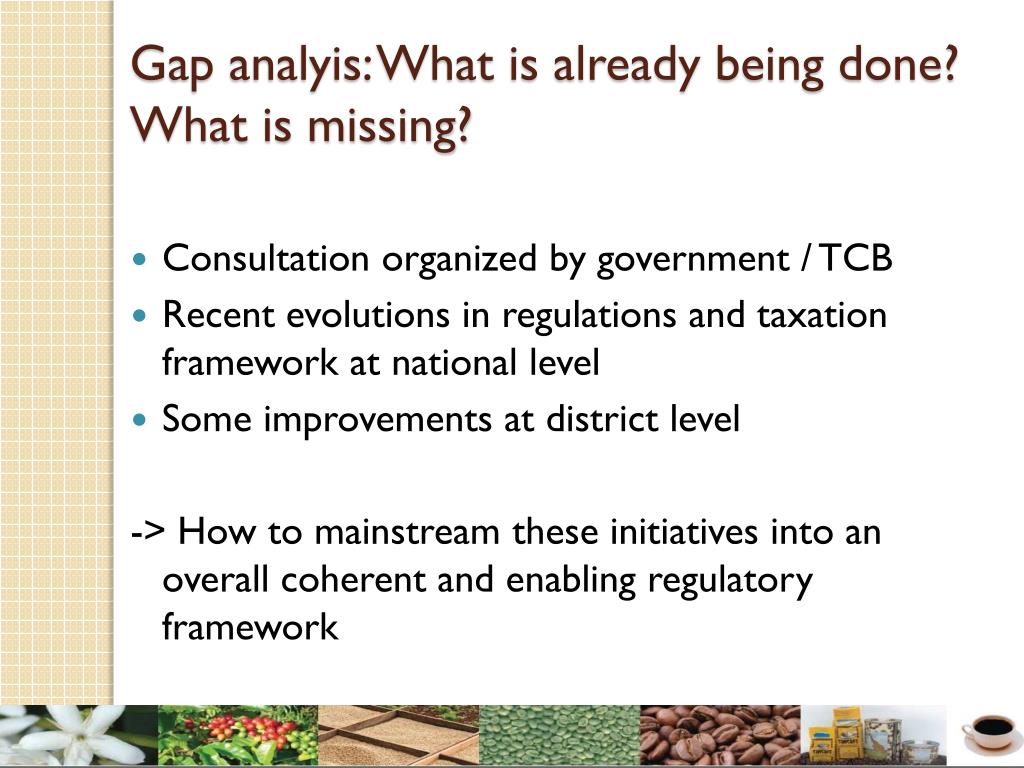 Gap analyis: What is already being done? What is missing? • Consultation organized by government / TCB • Recentevolutions in regulations and taxation frameworkat national level • Someimprovementsat district level -> How to mainstreamthese initiatives into an overallcoherent and enablingregulatoryframework
