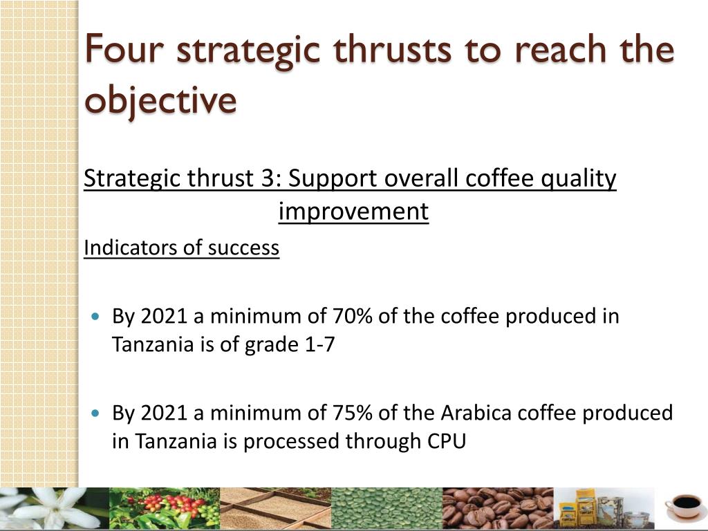Four strategic thrusts to reach the objective Strategic thrust 3: Support overall coffee quality improvement Indicators of success • By 2021 a minimum of 70% of the coffee produced in Tanzania is of grade 1-7 • By 2021 a minimum of 75% of the Arabica coffee produced in Tanzania is processed through CPU